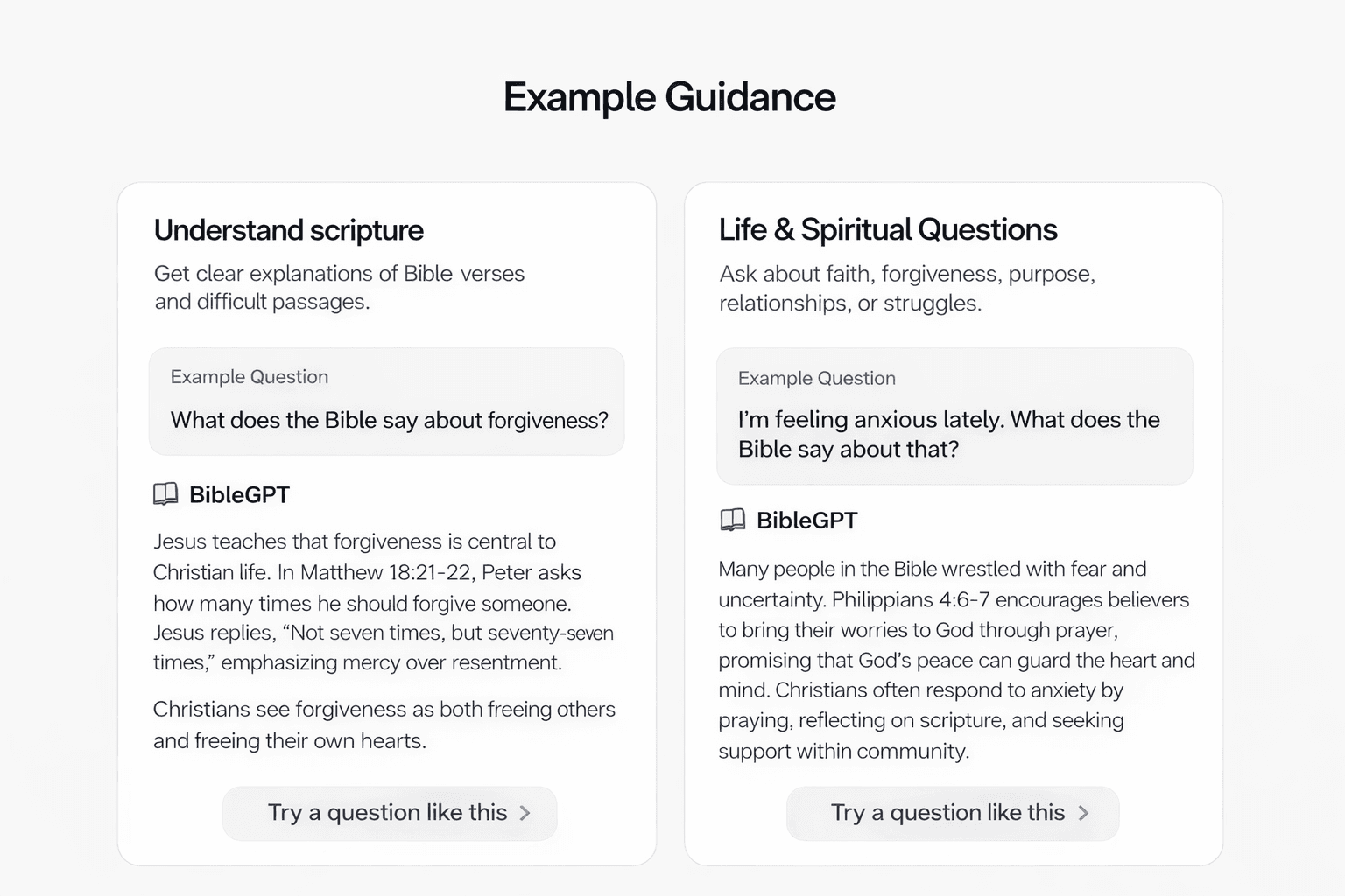 • I’m going through a difficult situation. What guidance does the Bible offer? • Can you explain a Bible passage in simple terms? • I’m curious about God but not sure what I believe. Where should I start? • How should I approach a Christian friend about a difficult topic? • I’m feeling anxious lately. Are there Bible verses that might help?